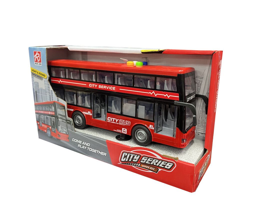 AUTOBUS DE DOS PISOS A FRICCION CITY SERIES. CUENTA CON EFECTOS DE SONIDO Y LUCES ADEMAS LAS PUERTA SE PUEDEN ABRIR Y CERRAR. DIMENSIONES DEL PACKAGING: 32 CM X 10 CM X 18 CM. FUNCIONA CON 3 PILAS AG13. (INCLUYA PILAS DE PRUEBA) EL MODELO VIENE EN 3 COLORES SURTIDOS: VERDE AZUL ROJO.