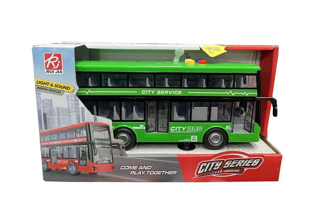 AUTOBUS DE DOS PISOS A FRICCION CITY SERIES. CUENTA CON EFECTOS DE SONIDO Y LUCES ADEMAS LAS PUERTA SE PUEDEN ABRIR Y CERRAR. DIMENSIONES DEL PACKAGING: 32 CM X 10 CM X 18 CM. FUNCIONA CON 3 PILAS AG13. (INCLUYA PILAS DE PRUEBA) EL MODELO VIENE EN 3 COLORES SURTIDOS: VERDE AZUL ROJO.