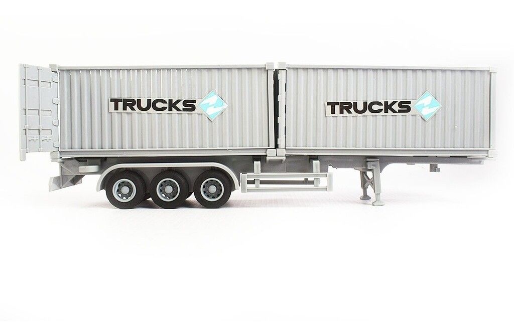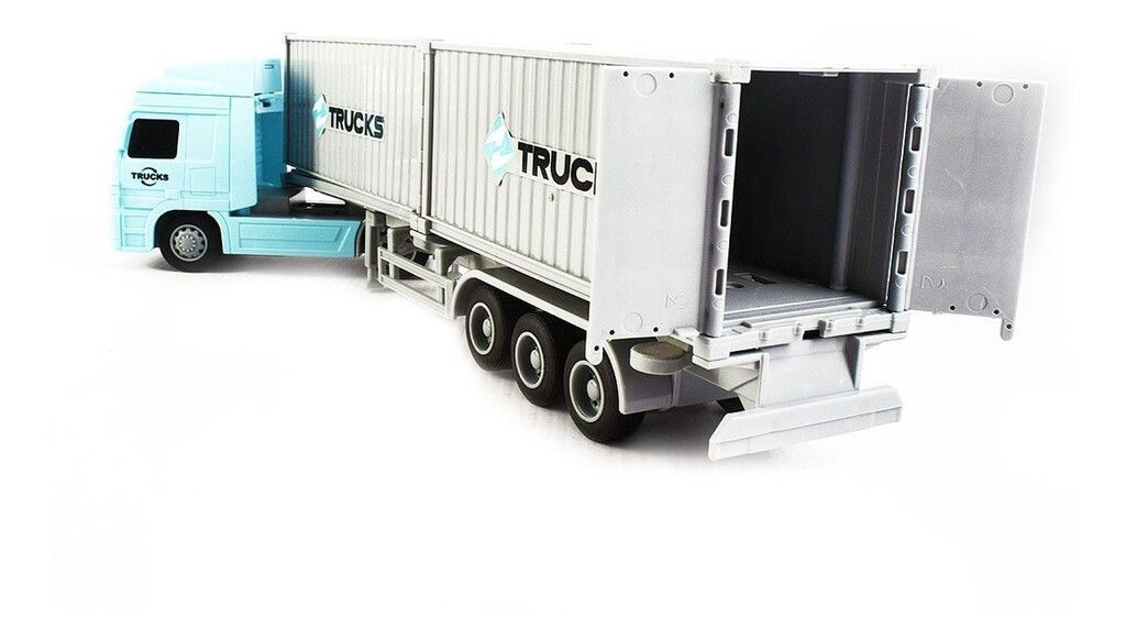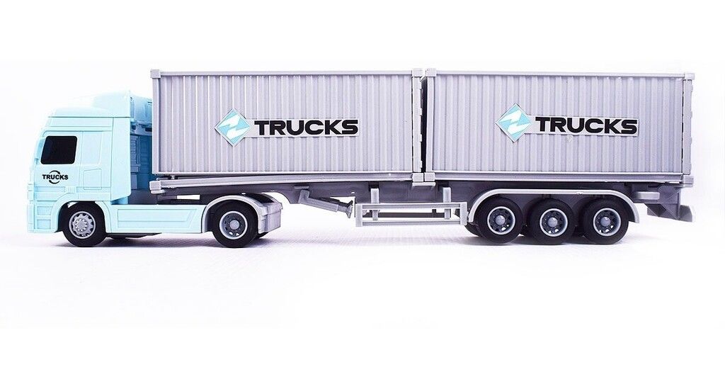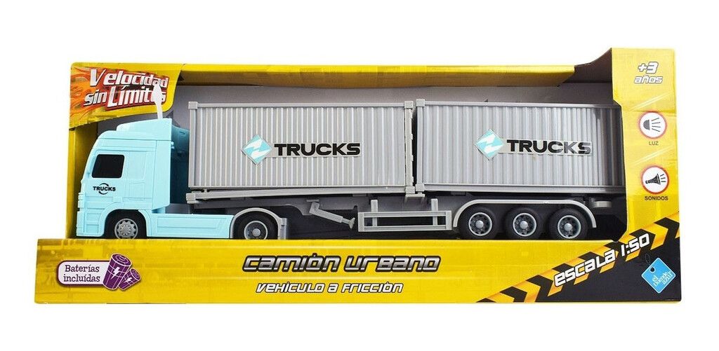 CAMION DOBLE CONTENEDOR A FRICCION CON LUZ Y SONIDO EL DUENDE AZUL ESTE MODELO ES PARTE DE UNA COLECCION DE VARIOS CAMIONES CON DIFERENTES ACOPLADOS! COLECCIONALOS Y CONVIERTETE EN TODO UN EXPERTO DEL TRANSPORTE DE CARGAS PESADAS.