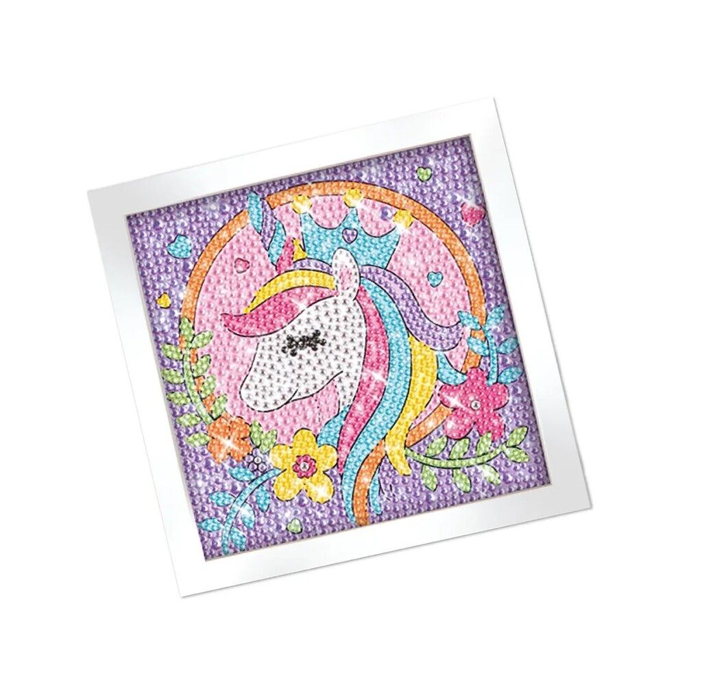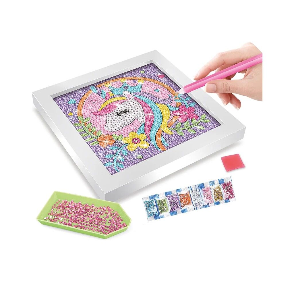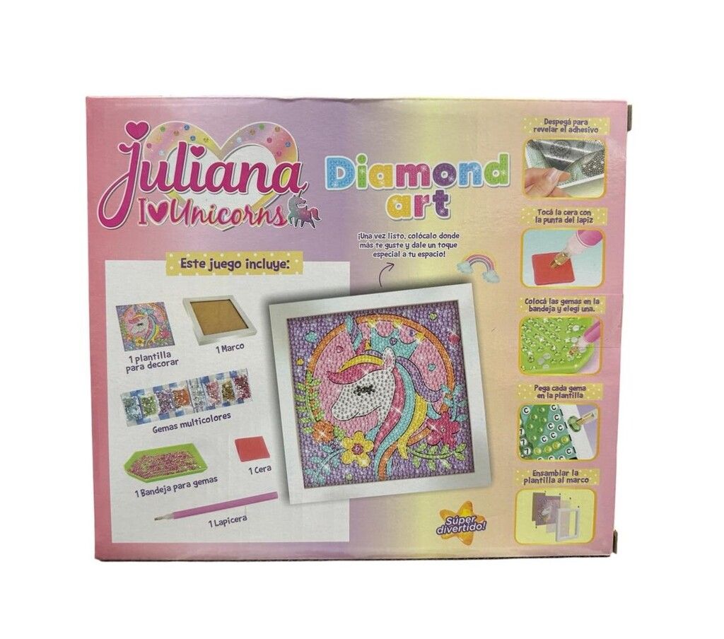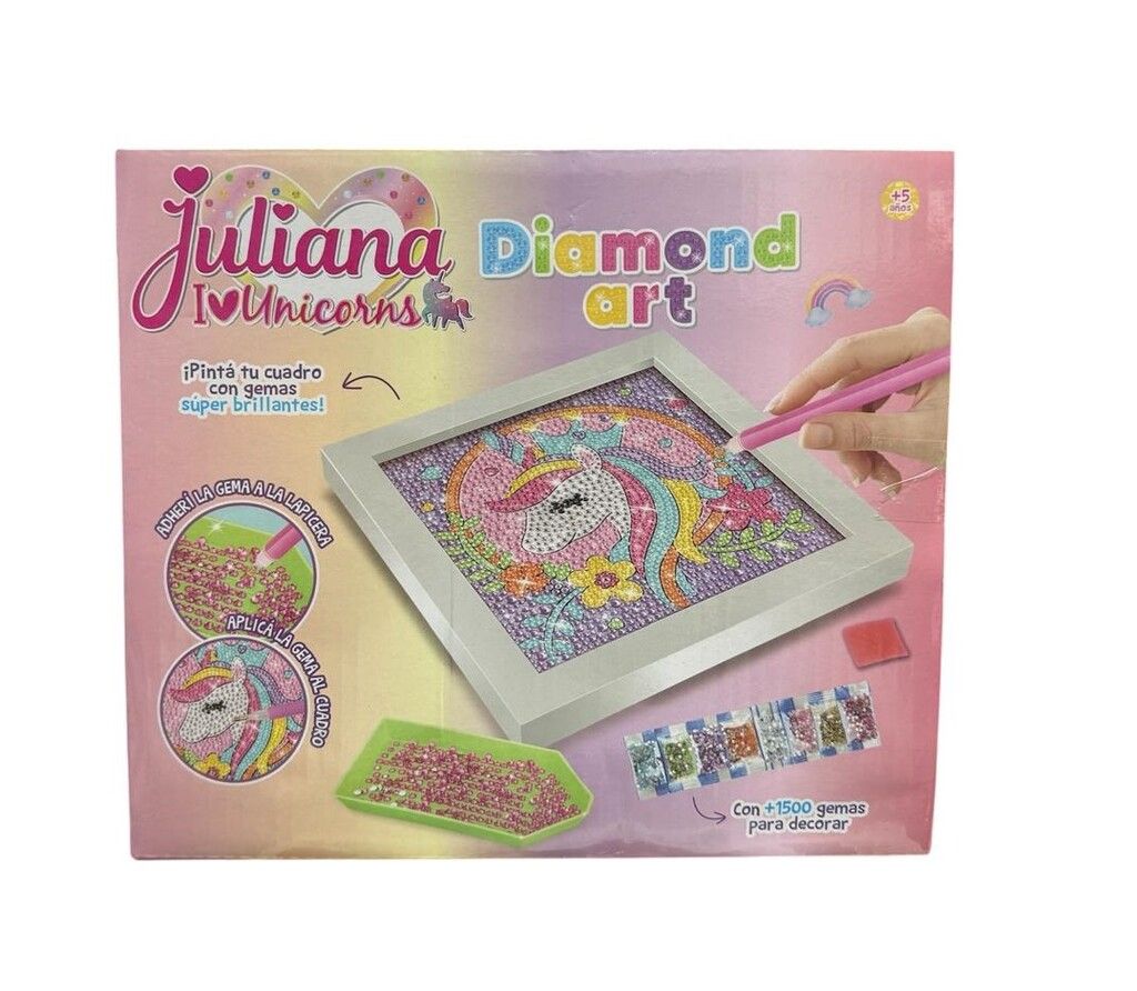 CON JULIANA DIAMOND ART UNICORNIO LA MAGIA BRILLA EN CADA DETALLE. INCLUYE PLANTILLA Y GEMAS PARA DECORAR FACILMENTE EL ESPACIO QUE QUIERAS SUMANDO COLOR CREATIVIDAD Y UN TOQUE ENCANTADO. CONTENIDO: – 1 PLANTILLA PARA DECORAR. – 1 MARCO. – 13 PAQUETITOS CON GEMAS DE COLORES. – 1 BANDEJA PARA GEMAS. – 1 CERA Y 1 LAPICERA. CARACTERISTICAS_ – MEDIDAS PLANTILLA: 17 CM DE ALTO X 17 CM DE LARGO APROX. – EDAD RECOMENDADA: +5 ANOS.
