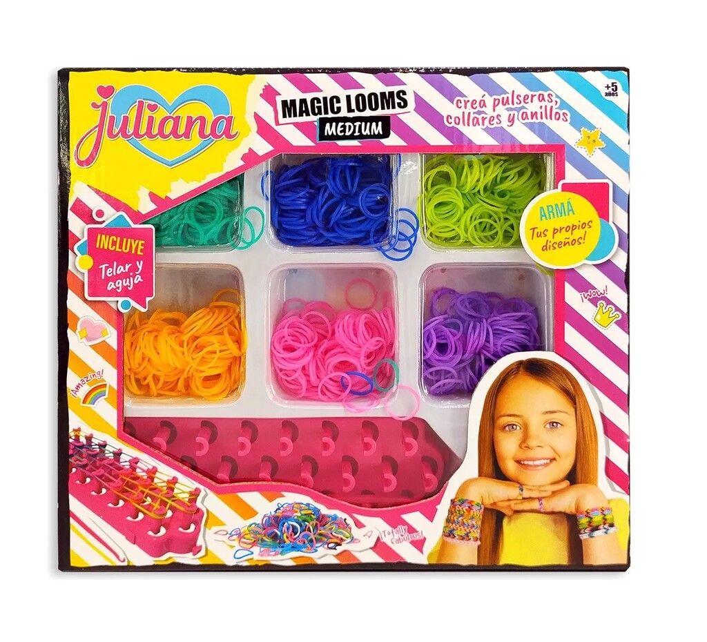 DESCRIPCION DEL PRODUCTO ? JULIANA MAGIC LOOMS MEDIUM ? INCLUYE TELAR AGUJA BANDITAS DE COLORES Y GANCHITOS! ? CON MANUAL DE INSTRUCCIONES! ? CREA PULSERAS COLLARES Y ANILLOS CON TUS PROPIOS DISENOS! ? MEDIDAS DEL PACKAGING: 26 5 CM X 23 5 CM X 4 CM ? MEDIDAS DEL TELAR: 17 CM X 5 CM X 3 CM ? EDAD MINIMA RECOMENDADA: +5 ANOS. LAS IMAGENES SON DE MODO ILUSTRATIVAS LOS COLORES PUEDEN VARIAR