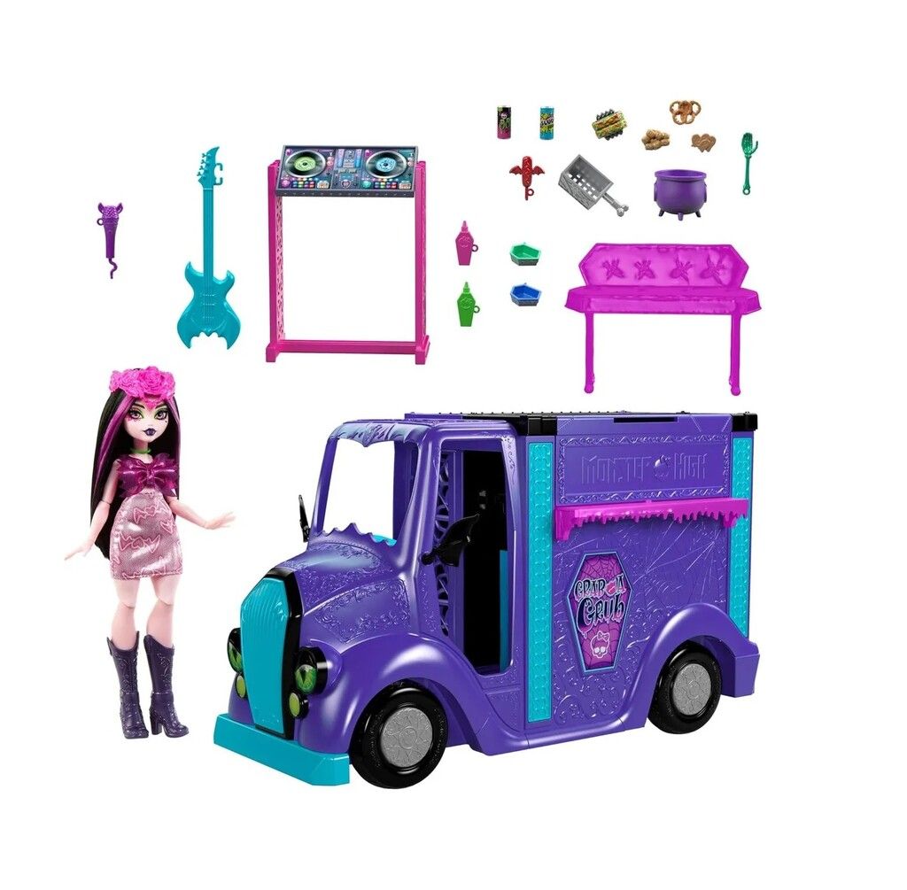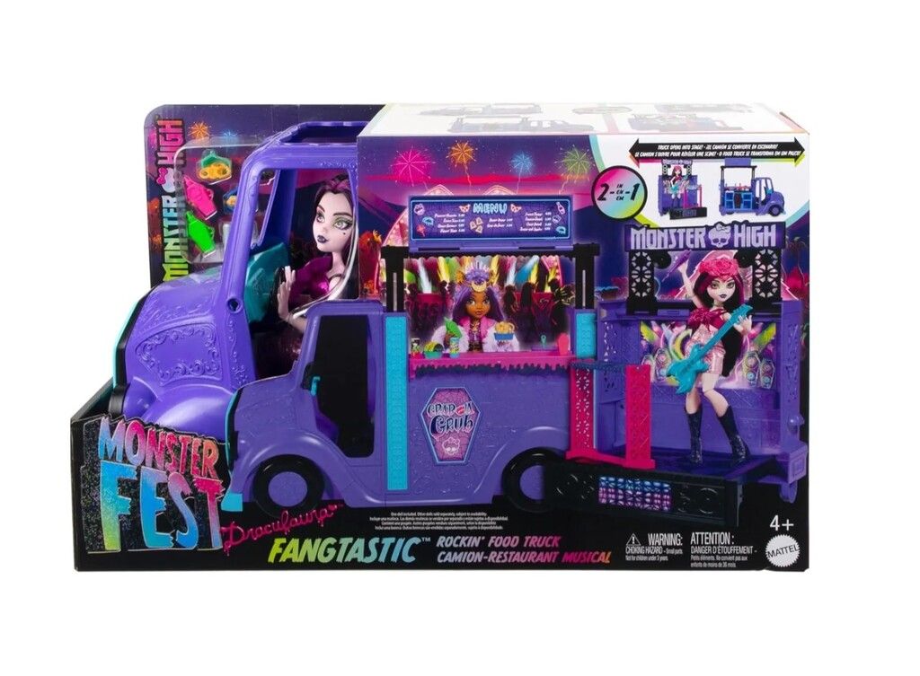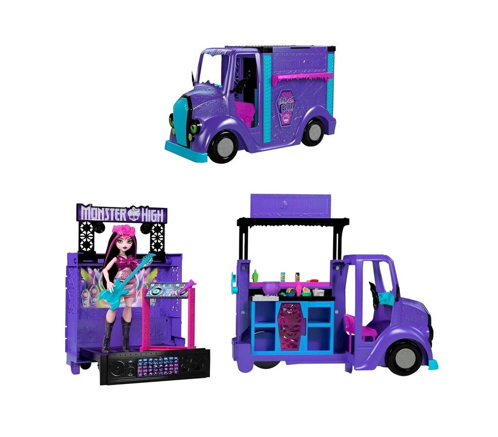 ADENTRATE EN EL EMOCIONANTE MUNDO DE MONSTER HIGH CON EL CAMION ROKIN FOOD DE DRACULAURA. ESTE VIBRANTE CAMION DE COLOR VIOLETA DISENADO PARA BRINDAR HORAS DE DIVERSION CREATIVA ES IDEAL PARA NINOS A PARTIR DE 4 ANOS. SU LLAMATIVA ESTETICA COMBINA A LA PERFECCION LA TEMATICA GOTICA DE MONSTER HIGH CON LA DIVERSION DE UN NEGOCIO DE COMIDA SOBRE RUEDAS.