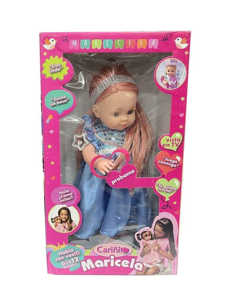 MUNECA MARICELA PRINCESA QUE HABLA ——————————————————————————————- DESCRIPCION DEL PRODUCTO – HABLA 4 FRASES -DIFERENTES ROPAS – VESTIDA DE PRINCESA CON CORONA Y COLLAR