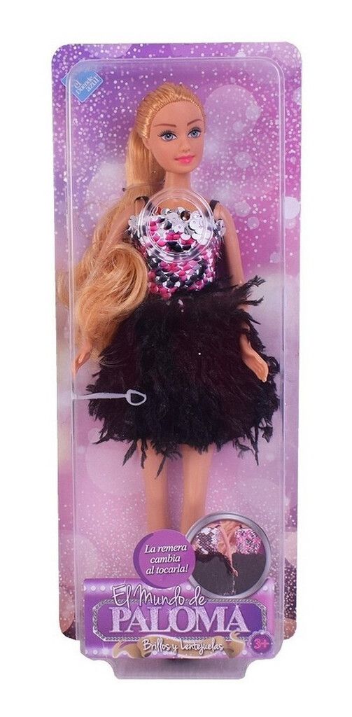 MUNECA PALOMA BRILLOS Y LENTEJUELAS A PALOMA LE FASCINA LUCIR SIEMPRE A LA MODA- ENTRE SUS PRENDAS PREFERIDAS- ESTAN LOS VESTIDOS CON BRILLOS Y LENTEJUELAS- LOS CUALES TIENEN DE VARIOS COLORES. PARA SUS SALIDAS- COMBINA ESTOS VESTIDOS CON DIVINOS ZAPATOS. – LA REMERA CAMBIA AL TOCARLA!! MEDIDA- 30 CM.